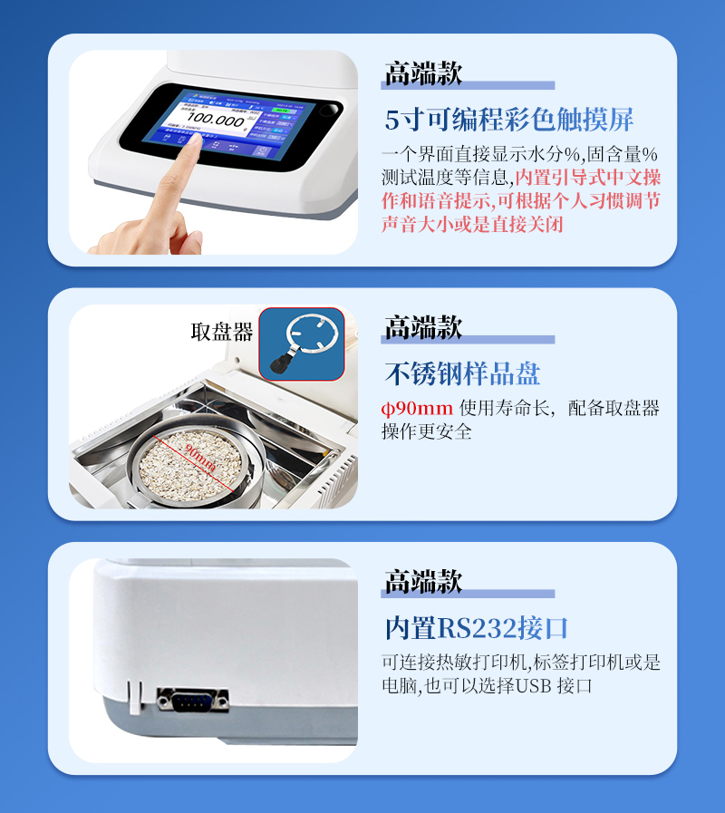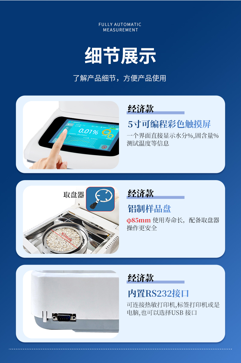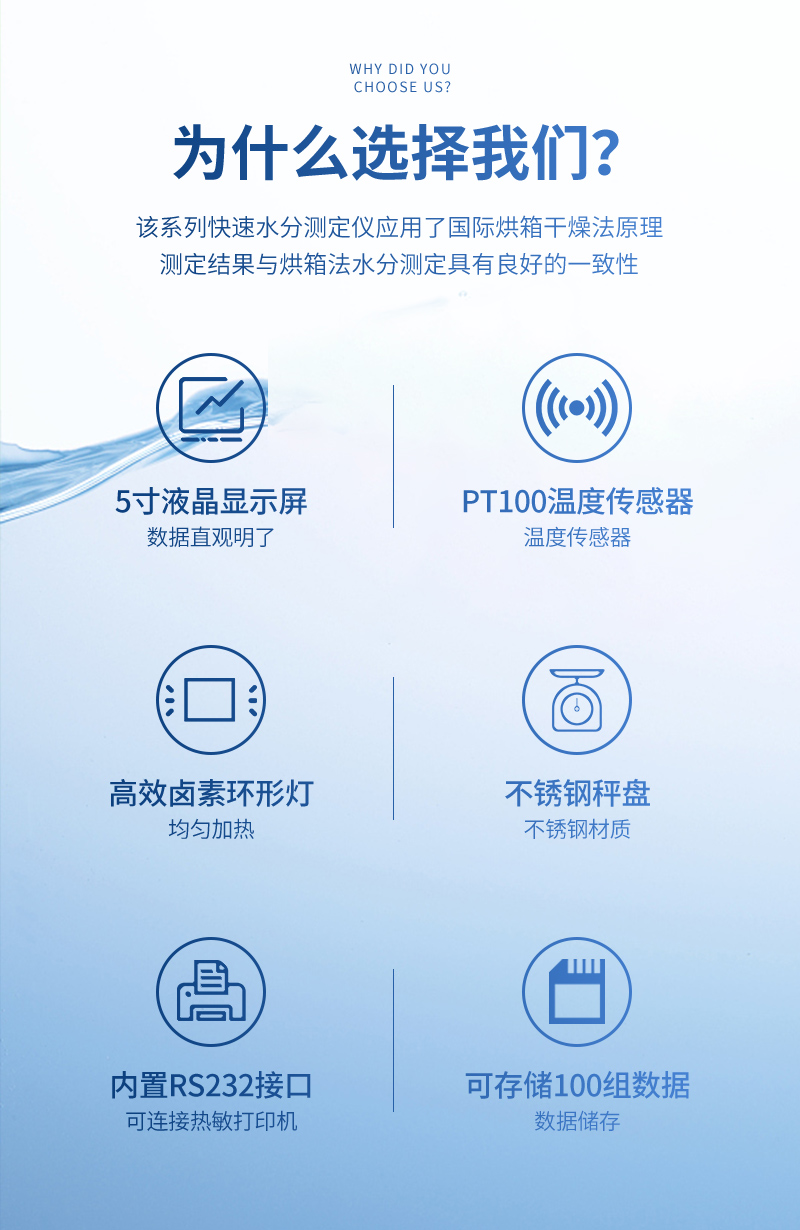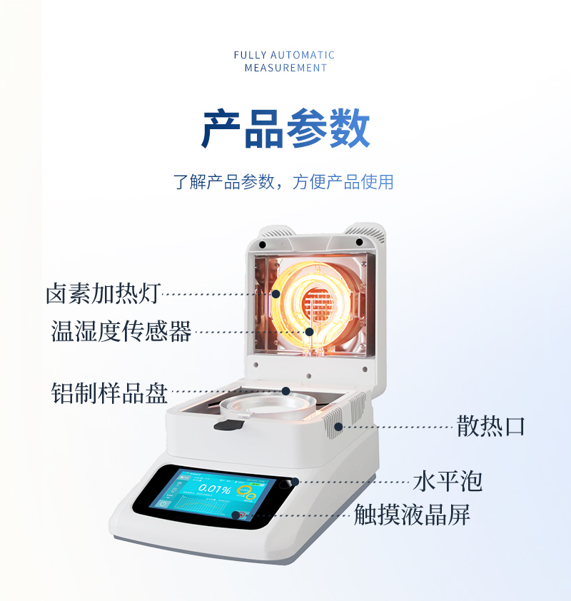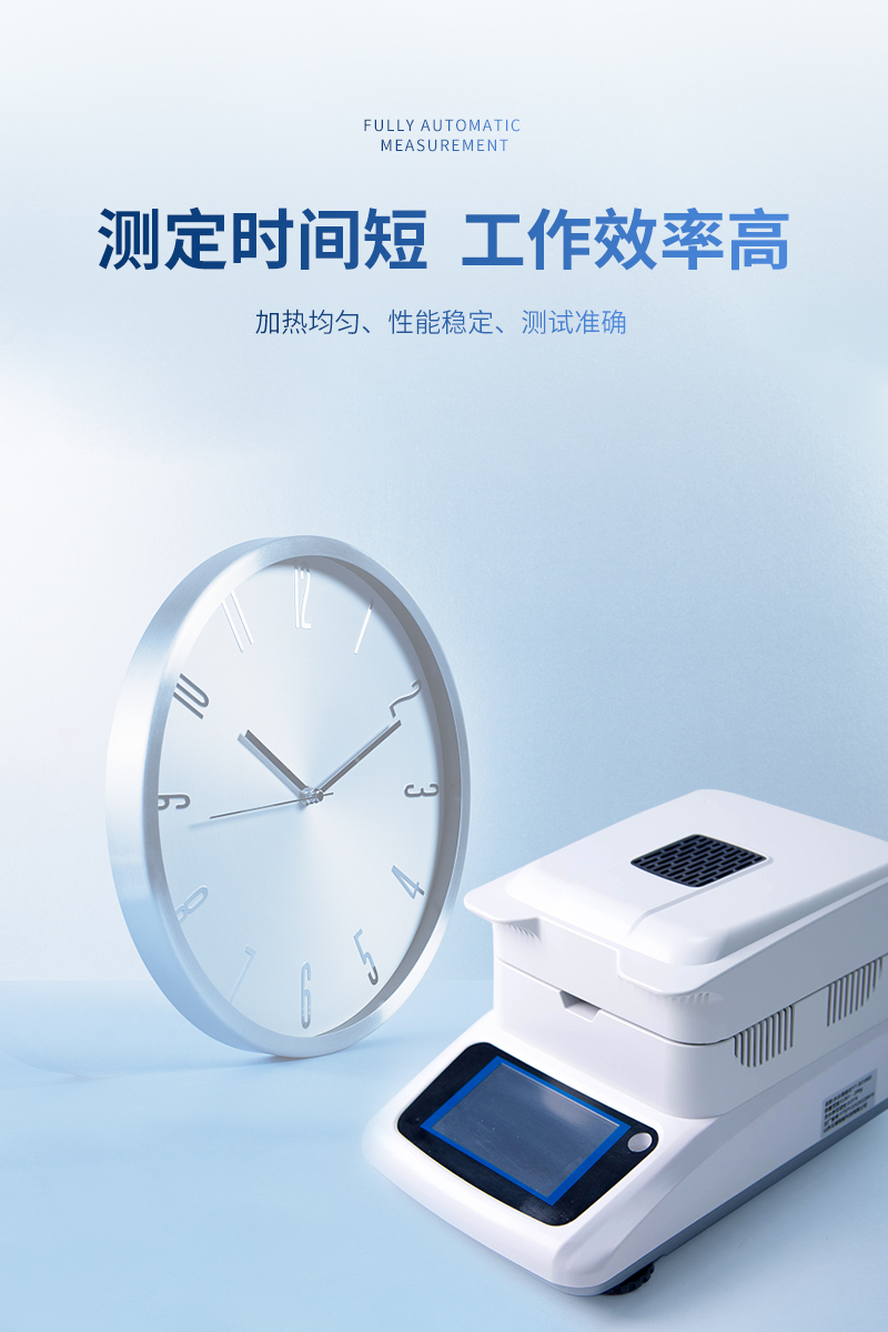 該系列快速水分測定儀應用了國際烘箱干燥法原理,測定結果與烘箱法水分測定具有良好的一致性,工作效率卻遠遠高于烘箱法水分測定,一般樣品只需要幾分鐘即可測量完畢,因此受到廣大用戶的青睞與好評。